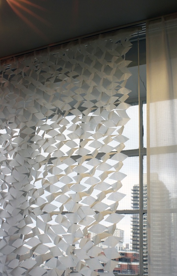 Energy is a new laser cut product that assumes a three-dimensional quality through the ingenious placing of silts, which, when suspended, result in vibrating shapes. The papery material lends the voluminous fabric a light and sculpturesque appearance.
