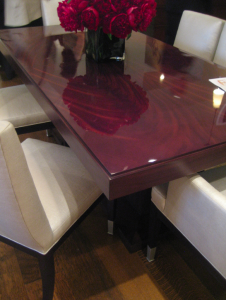 Rumley also selected and arranged the beautiful flowers that filled the showroom. This elegant, and simple, arrangement sits on top of the equally chic dining table in the collection, a double-pedestal base with a high-gloss mahogany top.