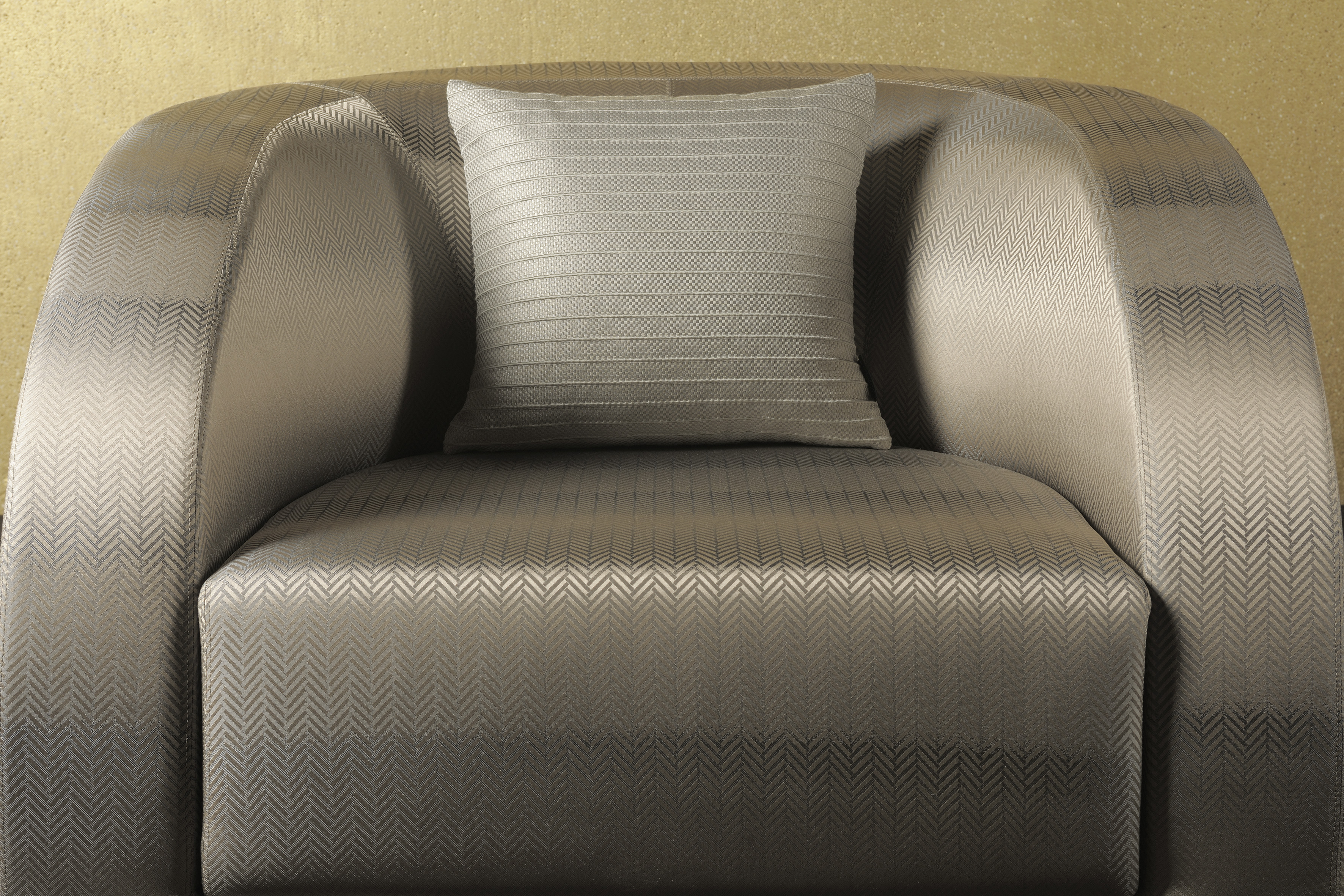 Faver's chevron pattern (as chair upholstery above) is tempered by a horizontal fading gradient stripe. This silk-viscose blend is intended for decorative applications. The horizontal stripe Fukui is classic Armani/Casa with its damier and cannete forms. Both are available in five (complementary) colors.