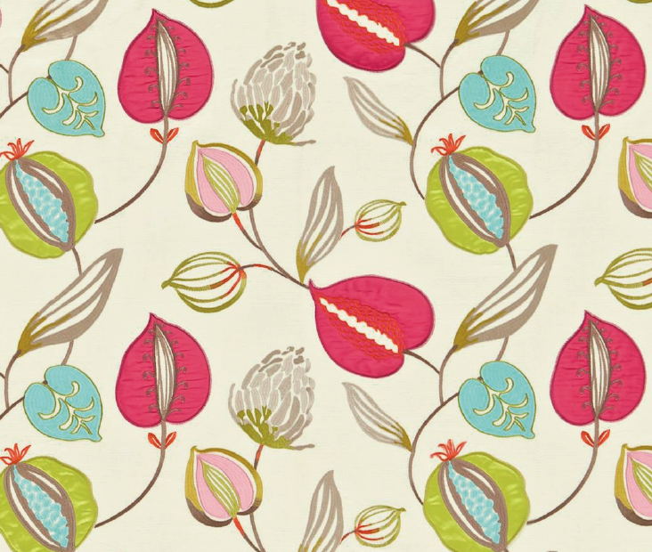 Intended for drapery and accessories, Tembok includes three embroidered designs in a range of colors, starting at $55 per yard. In addition, there's a range of 48 coordinating satins, ideal for both drapery and upholstery, and extremely well-priced at $34 per yard.