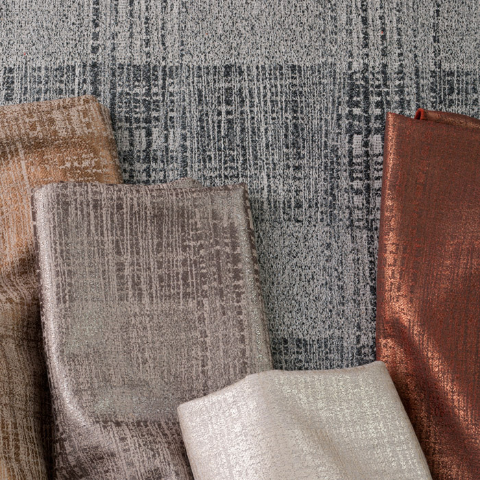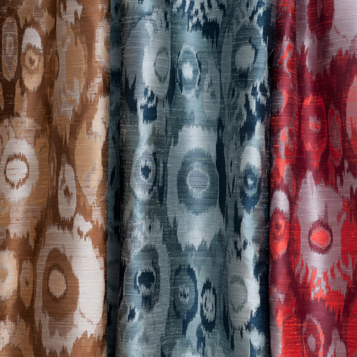 Our personal favorite, Moondance, has a woven almost-ikat pattern in a polyester-silk that evokes the glowing moon at night. Can't you just hear the song playing in the background? It comes in eight colorways, and wouldn't it make a terrific wallcovering?