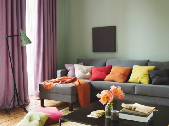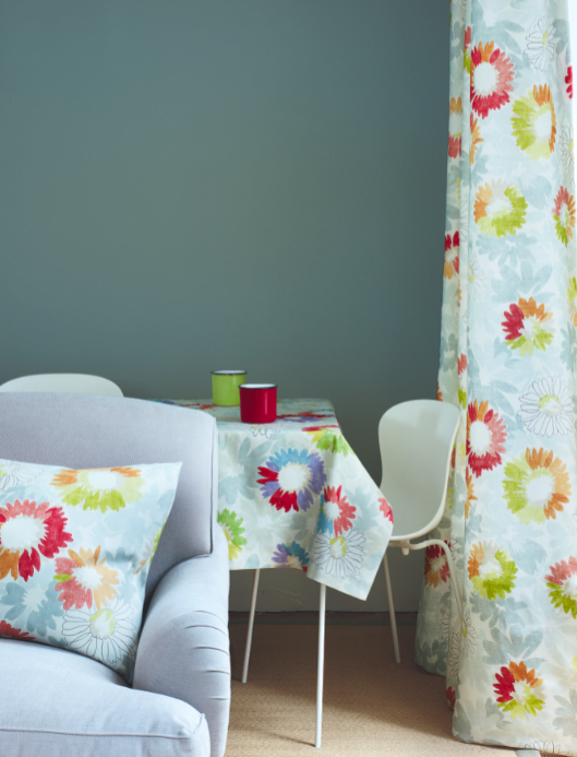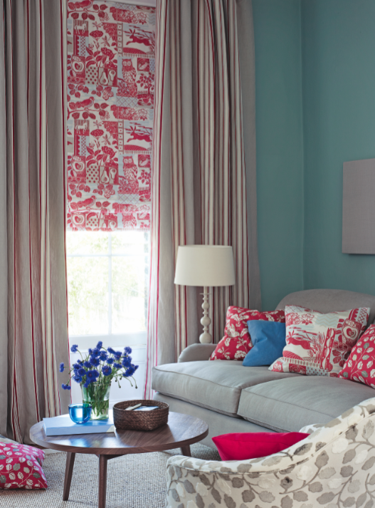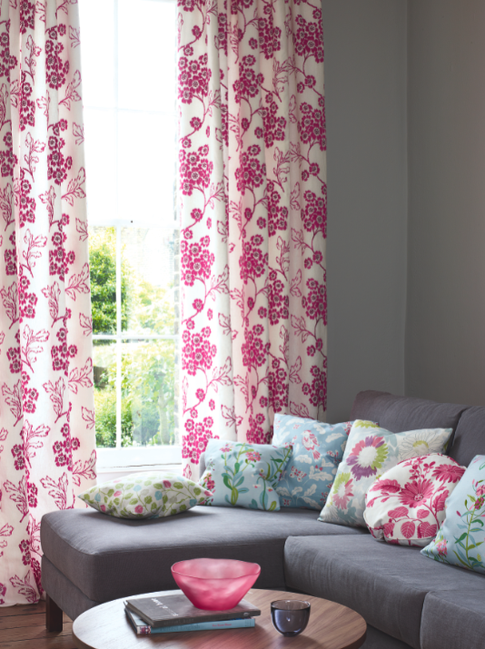 Jane is known for her love of aquas and this year it's complemented with a fresh range of pinks. The curtains are in linen-blend Hayden.