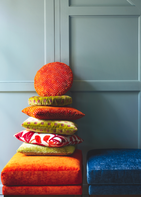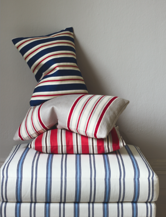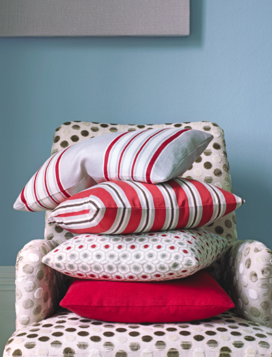 Lisson is a lovely Italian cotton with a slightly vintage finish that we know will be snapped up for upholstery, and in such a lovely palette, seen here on the red pillow at the bottom of the stack: