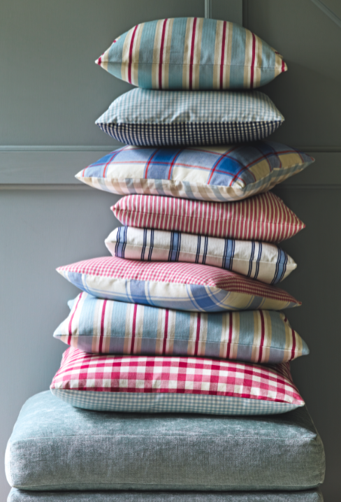 Don't miss the cotton check and stripe book, which feels quintessentially English. There are pinstripes and ginghams in nine colors, including two sizes of checks, some of which are seen in these adorable stack of pillows. Don't you just want them all?