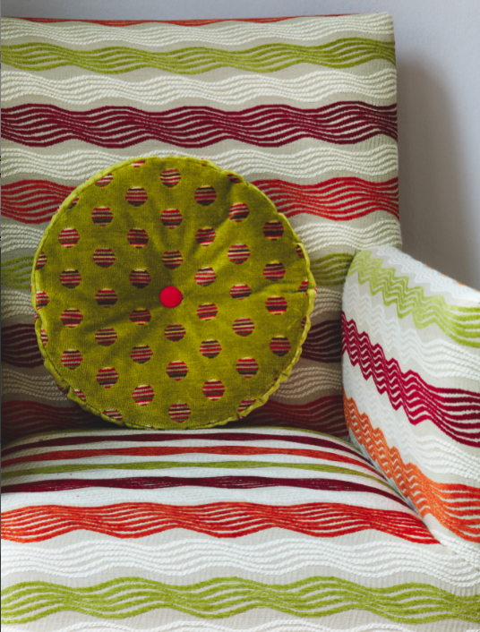 The chair is upholstered in a vibrant Furrow Stripe, which is available in six colors and a fun way to add movement to a traditionally boxy chair shape: