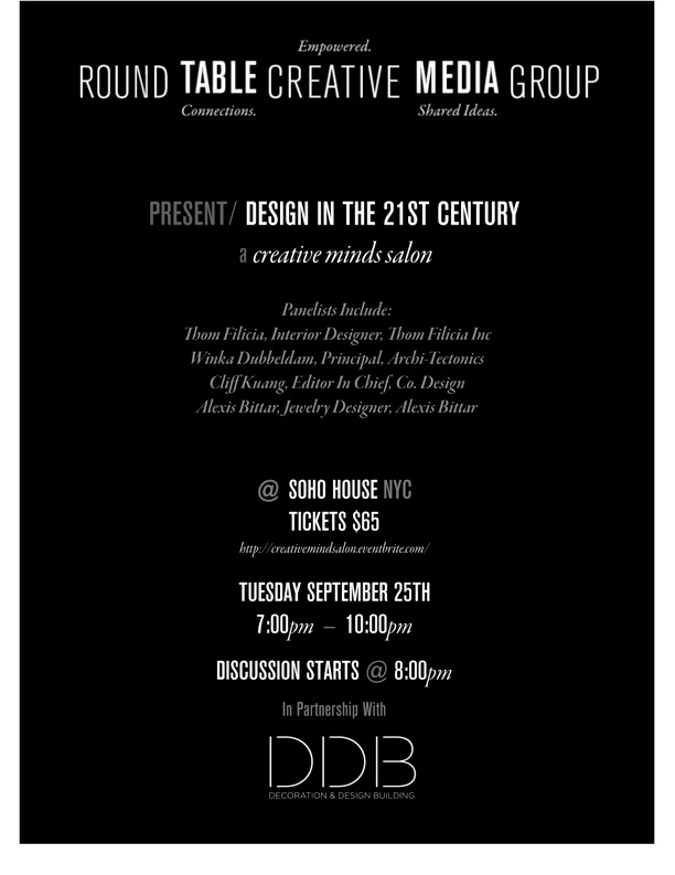 Purchase your ticket now to spend the evening of Tuesday, September 25 at the SoHo House with the DDB. "Design in the 21st Century" will be a contemporary take on a salon, only more fun! The creative minds salon will feature panelists Thom Filicia, interior designer; Winka Dubbeldam, Principal of Archi-Tectonics; Cliff Kuang, Editor-in-Chief of Co. Design; and Alexis Bittar of the eponymous jewelry line.