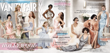 The photograph, by Mario Testino, features the “fresh young stars of 2012” lounging across a three-panel foldout. The stars include Rooney Mara, Mia Wasikowska, Jennifer Lawrence, and Jessica Chastain.